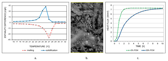 The thermophysical properties of the materials being discussed in this section are contained in Table 1, for a simple opaque building envelope that contains as a core a 0.14 m thick thermal insulation layer. The considered envelope contained the following, in series: (i) 0.013 m thick gypsum board; (ii) 0.140 m thick layer of cellulose insulation, or PCM-enhanced cellulose insulation; (iii) 0.013 m thick plywood board; and (iv) 0.013 m thick layer of exterior finish material. A curve showing the enthalpy relation with temperature is depicted in Figure 3a for used PCM. Figure 3c contains a comparison of heat fluxes across a 140 mm layer of cellulose fiber and a second specimen of the cellulose insulation with 30 wt% of microencapsulated organic PCM. The heat fluxes are the result of a rapid increase in temperature from 14 to 44 °C, on one surface.