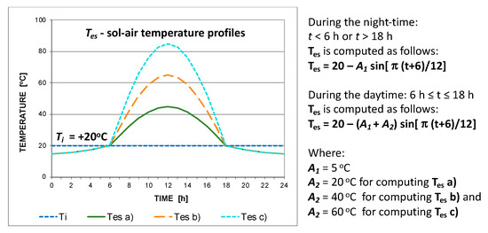 Tes is the so-called sol-air temperature [24]. After consideration of Rse = 0.04 m2·K/W, solar radiation flux of 1000 W/m2 makes (Tes − Te) by 40 °C.