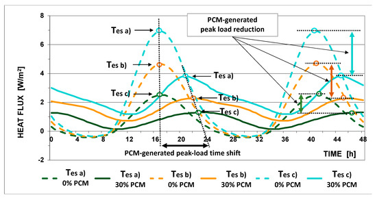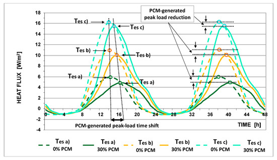In addition, an approximate 50% decrease in peak heat flow values was observed. In the case of a 14 cm assembly, the PCM-enhanced thermal insulation did not generate large reductions in total daily heat flow rates, except for the case of the lowest sol-air temperatures during the day, as shown in Figure 4. These results show that an increased thickness of thermal insulation reduces the peak time value of cooling loads but does not generate a significant time shift of the peak cooling load. In the case of PCMs, the factors that impact time delay of the envelope-generated thermal response are PCM enthalpy and the amplitude of external temperature excitations.