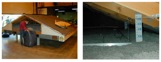 A series of dynamic hot box experiments were performed on an attic assembly insulated with loose-fill cellulose, pictured in Figure 7. The attic module was tested under periodic temperature fluctuations in a large-scale climate simulator (LSCS), a large horizontal hot box, at the Oak Ridge National Laboratory [40]. In addition to the attic insulated conventional cellulose insulation, two loadings of microencapsulated PCM with a melting point at approximately 27 °C and phase change enthalpy of approximately 120 kJ/kg were tested in blends with cellulose (5% and 20% by weight, and approximately 0.8 to 1.0 kg and 3.0 kg of PCM per m2 of roof assembly).