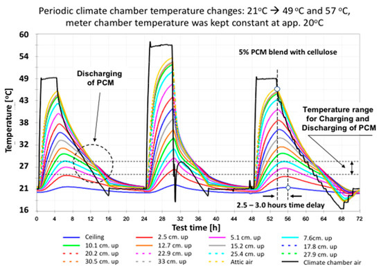 The insulation thickness was 33 cm. The main focus of the attic tests was the PCM discharging time (solidification). PCM charging (PCM melting) is quite intensive and fast in attics, because of the rapid morning increase in temperature caused by the sun. However, the attic cooling process is significantly slower. In a well-designed PCM application, during the night, 100% of the PCM should fully discharge before morning. During the dynamic LSCS tests, the attic was subjected to changes of temperature to 21 °C for about 16 h, rapid temperature ramps to 49 °C or 57 °C, and exposure to 49 °C or 57° C for about 4 h, followed by natural cooling back to 21 °C. The array of thermocouples installed at 2.5 cm intervals was used to monitor the temperature distribution across the layer of insulation with a 33 cm thickness.