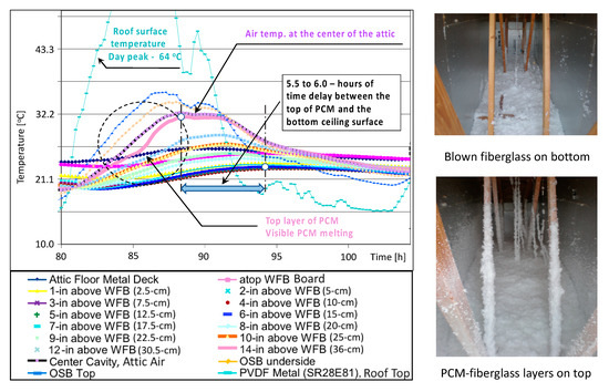 In this field experiment, an advanced attic configuration was used. In addition to PCM, it contained above-deck ventilation and a metal roof surface with high solar reflectance (a cool roof, SR28 and TE81). Monitored data included the following: (i) the temperatures of the roof deck on both sides of the 1.6 cm oriented strand board and the heat flux transmitted through the roof deck, (ii) attic air temperature, (iii) temperature profile across attic insulation and PCM layers, and (iv) bottom of the attic temperature. A comparison of recorded times for the temperature peaks (maxima) on the top of the attic PCM-insulation surface and on the bottom of the attic floor, as shown in Figure 9, indicates that the time delay in transmission of a peak thermal excitation across the entire 36 cm thick attic thermal insulation system (including PCM) is about 5.5 to 6 h. During the day of these measurements, the peak top roof surface temperature was around 64 °C. This agrees quite well with the theoretical data in Table 1 for dispersed PCM applications.