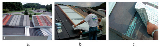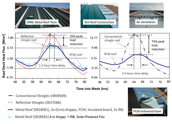 - Kośny, J.; Biswas, K.; Miller, W.A.; Childs, P.; Kriner, S. Sustainable retrofit of residential roofs using metal roofing panels, thin-film photovoltaic laminates and PCM heat sink technology. In Proceedings of the JBED, Washington, DC, USA, 30 April 2020. [Google Scholar]