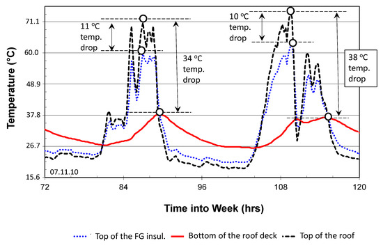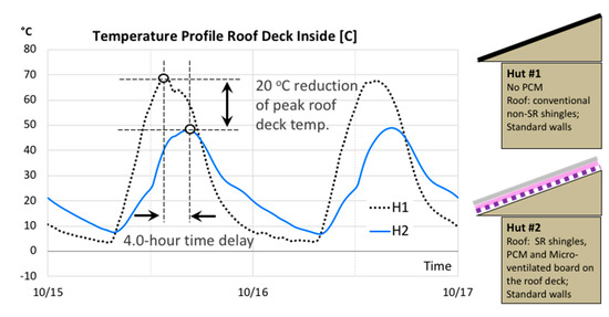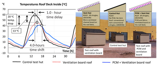 The thermal performance of the previously described metal PV-PCM roof, presented in Figure 16, was monitored through several seasons and compared with a traditional shingle roof and differently constructed metal roofs using reflective cool coatings [44,46]. As shown in Figure 19, the summer maximum roof surface temperature can be as high as 80 °C. At the same time, the maximum temperature of the underside surface of the roof deck can be 40 °C lower than the surface temperature. In this roof, the first component of the thermal disconnect system, which works as a thermal break and provides above-deck ventilation, is the 5.7 cm thick air containing a radiant barrier. For comparison, the peak time temperature on top of the layer of thermal insulations (dense fiberglass installed just behind the air cavity and over the PCM) is about 10 °C lower than that measured on the exterior roof surface.