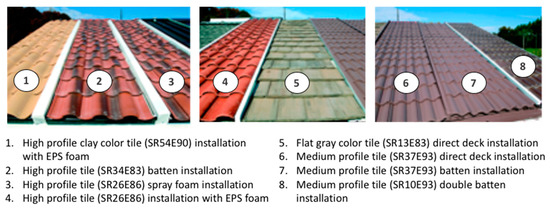 As shown in Figure 14, a high-profile tile roof with conventional terra-cotta color pigments (SR34E83) was tested on nominal 2.5 × 2.5 cm wood battens (wood spacers). Two more roofs, one with high-profile concrete tile having a splotchy terra-cotta finish (SR26E86) and the other one with a high-profile clay tile with cool-colored pigments (SR54E90), were each placed on 3.2 cm thick layer of expanded polystyrene foam (EPS) adhered to the deck using a spray polyurethane adhesive.