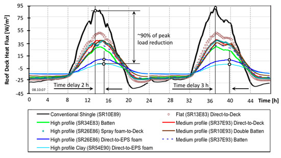 Thermal performance comparisons of eight test roof assemblies show that in addition to the thermal mass of concrete and clay tiles, the key thermal disconnect measures impacting the magnitude of roof’s diurnal peak loads are the following: (i) amount of over-the-deck insulation, (ii) radiative properties of the roof surface, and (iii) the depth of the above-deck ventilation cavity. Two roof designs constructed with high-profile tiles installed on top of a 3.2 cm thick layer of EPS foam demonstrated significantly better thermal performance than the other test roofs. This indicates that, in the case of thermally massive roof tops, the overall thermal resistance of materials and systems installed on top of the roof deck is a key material characteristic affecting the peak load time shift and decreasing the peak heat transfer. As depicted in Figure 15, the additional thermal resistance of EPS foam (RSI-0.85 m2·K/W) under the high-profile terra-cotta tile helped shift the time of the peak thermal load by 2 to 3 h, as well as reduced peak heat transfer by over 80% of that measured for the control shingle roof. Even further reductions in deck heat transfer (close to 90%) were observed with the clay tile roof, because its solar reflectance was twice that of the terra-cotta tile. In roof-attic assemblies having additional attic floor insulation, the shape of the peak load curve (for roof-generated thermal loads) can be even further flattened and delayed in time, as shown in Figure 8 and Figure 9.
