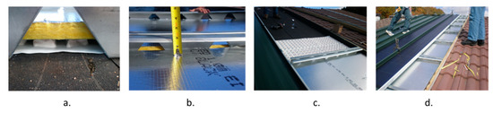 Components of the experimental roof containing roof-installed PV and advance thermal disconnect system with organic PCM heat storage. (a) Location of the PCM heat sink directly on top of the roofing deck material and under the fiberglass insulation with air channels above; (b) Top of the fiberglass insulation with radiant barrier facing up; (c) A view of the open roof’s ventilation cavity with visible PCM pouches and top of the fiberglass insulation; (d) Installed metal roof with PV laminates (left) and open roof ventilation cavity before installation of the metal pane (right).
