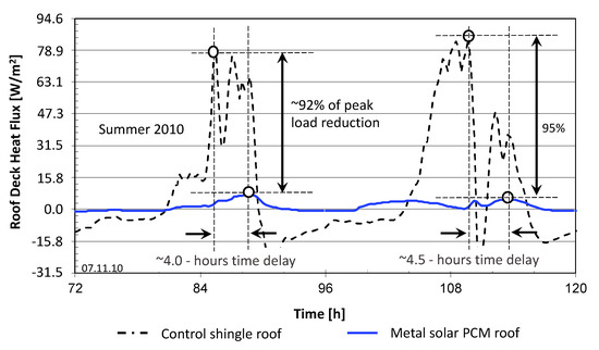 The analysis, presented in Table 2 and Figure 5 and Figure 6, shows that the rate of the peak load reduction and the scale of the time shifting directly depend on the magnitude of thermal excitation impacting the analyzed building envelope. Furthermore, the test data collected on a variety of roof-deck-installed dynamic thermal disconnect systems indicates that they can notably reduce the maximum temperature affecting the attics below, i.e., the lower the peak thermal excitation reaching the attic, the higher the load reduction rate and the longer the time shift generated by the PCM-enhanced attic floor thermal insulation. Considering that peak load shift generated by roof-deck-installed thermal disconnect technologies can be between 1 to 4 h, and taking into account, as presented in Table 2, the length of time shifts which can be generated by the PCM-enhanced attic floor insulation, it is clear that it is possible to design roofs which can shift the roof generated cooling loads by more than 10 h. The data discussed in this paper presents unique design considerations for using building envelopes as key components of dynamic peak energy load management in buildings.