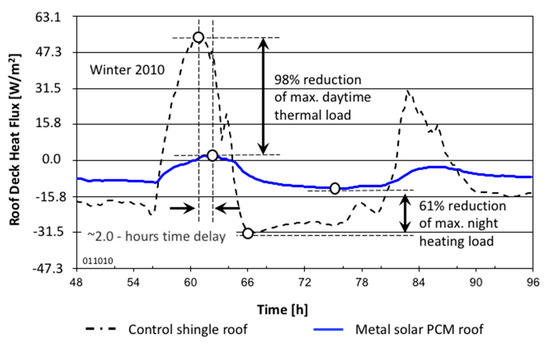 In general, in roof assemblies where over-the-deck ventilation, radiant barrier, or thermal insulation are used, the attic space below is exposed to significantly lower thermal stresses as compared with typical North American roofs, where shingles are installed on top of a thin layer of underlayment which is directly placed on the roof deck surface. This experiment proved that a dynamic thermal disconnect system utilized in the construction of the PV-PCM roof worked exceptionally well. However, note that the PV-PCM roof was topped with highly absorbing PV laminate. From a thermal performance perspective, the PV laminate was obviously a disadvantage. This resulted in similar peak roof surface temperatures as in the case of conventional shingle roofs [44]. Therefore, any potential benefits of the previously discussed cool roofs using solar reflective coatings were eliminated. The overall thermal performance of the PV-PCM roof data depended on the physical characteristics and effectiveness of the thermal disconnect system installed below the roof surface. This experiment further showed that lightweight sloped roof structures utilizing an over-the-deck thermal disconnect could generate a significant time shift in the peak thermal load generated by the roof. Figure 17 and Figure 18 present comparisons of heat fluxes measured on the bottom surfaces of the roof decks for a PV-PCM roof and a conventional shingle roof, during both the summer and winter. As shown in Figure 17, the test roof with PV laminate and thermal disconnect over the deck, reduced the peak time thermal load by over 90% during the summer. Furthermore, a time shift of four hours was recorded. Both of these features are very useful from the perspective of the whole building thermal response control and management of the cooling energy demand.