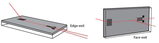 Leaky-mode surface-acoustic-wave (SAW) LiNbO3 devices can be categorized into two groups: edge-exit and face-exit (as illustrated in Figure 1). Edge-exit devices have a wide deflection angle [10] and have various potential applications, notably a holo-video monitor [7,11]. Face-exit leaky devices, however, suffer from a reduced deflection angle. The main reason to use face-exit devices for a near-eye display is that the output of the display is angled toward the user and requires little to no external redirection (which would not be the case for an edge-exit device) [10,12]. Another notable reason includes removing the zero-order light from the image without the need for a polarizer, which the edge-exit device requires. Finally, by using the entire face, these devices remove the limit to the numerical aperture created by the edge-exit variety.