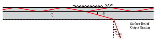 We provide a brief overview of the SAW–light interaction in Figure 2. A single-mode waveguide carries polarized light at some initial angle, , until the light encounters a surface acoustic wave traveling along the top of the waveguide. These waves will interact [22], and the light will escape, or leak from, the waveguide at some angle . With the correct setup, the leaky light will eventually encounter the back face of the substrate, where a surface-relief grating allows it to escape the substrate at exit angle or “maximum deflection angle”, . The user’s eye would then be set behind this back plane at some set distance, and the total viewing area (or the total area that the user can look into and see an image) would be determined by the region over the device that allows for acousto-optic interaction.