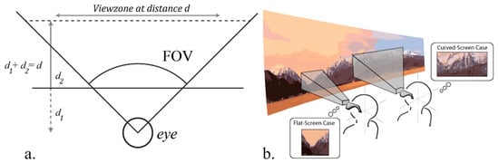 (a) Viewzone is defined by a viewable radial length at some distance, d; field of view (FOV) is the angle of information accessible by the eye. (b) The goal of this paper is to improve the FOV by curving the device’s active region. This will allow the user to see a greater viewzone.