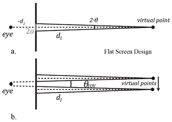 (a) The virtual point is limited by the aperture and distance drawn. The angle allowed by these parameters depends on the maximum deflection angle of the device. (b) The maximum length perceived by the eye at any distance is found by dragging the aperture along the active region until the back-traced rays fall just barely on the eye. The angle from the eye to the virtual points defines the FOV.
