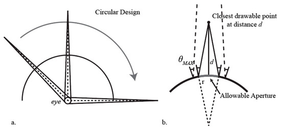(a) For a curved display with the eye placed at the radius of the curvature, as the virtual point is radially drawn at a fixed distance from the eye, the normal to the device will always fall on the eye, and the point is guaranteed to be seen by the eye. Thus, the FOV of the device is 180°. (b) The closest drawable point at distance, , is determined by the radius of curvature. As the curvature increases, the angle between the normals will offset the deflection on each side. This limits the closest point possible faster than in the flat case.