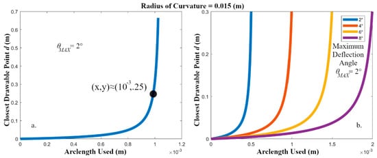 (a) As the arclength (2 in Figure 7) increases, the ability of the device to focus on a point near the eye is reduced. This eventually reaches a point where, due to the curvature of the device, the afforded by the device is insufficient to draw any point. (b) Here, we consider different deflection angles, . As expected, increasing the deflection angle allows us to use a larger arclength.