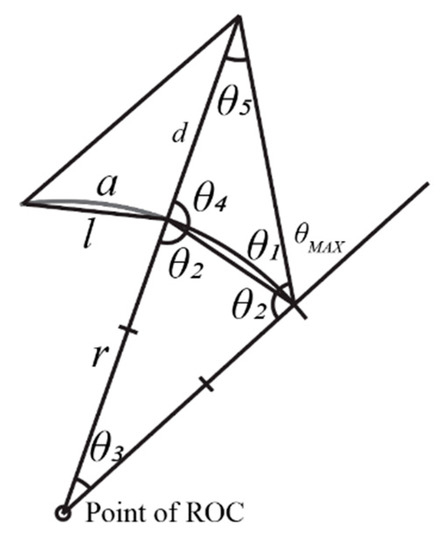 The variables in these equations are as follows: , as previously decided, is the closest drawable point, assuming we are using the maximum deflection allowed by the system. is the chord underneath the length , which runs along the region subtended by and represents half the allowable aperture of our system (given this closest drawable point and predetermined deflection angle). is equivalent to the FOV for the system, and is the radius of curvature. All other angles have no practical real-world meaning and serve only to find the final variables we seek.