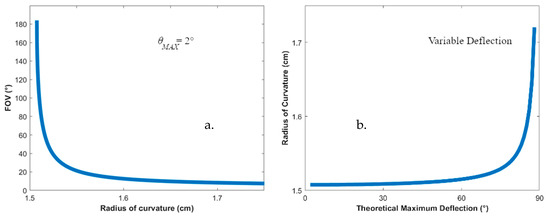 We also ask the question of whether we could move the ROC center past the eye by, one day, achieving a deflection angle greater than . Figure 8b considers this possibility. As we can see, even if this were the case, the device still fails to produce results much different from the case until we reach the 90° case, which obviously would produce the full FOV regardless of curvature. In this way, we see that the device performance depends almost exclusively on the correct curvature and eye placement and has very little to do with angular deflection capability.
