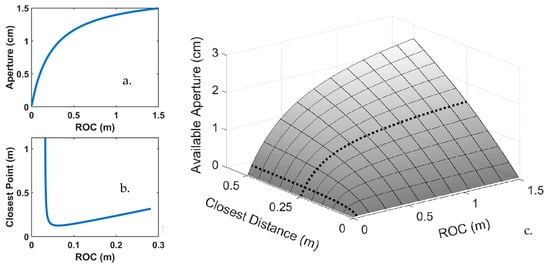 (a) The largest aperture allowed for the device is displayed here with respect to the radius of curvature (when ). The closest point the display can focus to is held at 25 cm (from the eye). (b) The closest point the display can focus to is displayed here with respect to the radius of curvature (when ). The aperture size (created by the active region of the device) is held at 2.2 mm. (c) Figure 6a and Figure 10a are 2D cross-sections of this plot; they are shown as dashed lines. The intersection point is chosen for the preferred instantiation in Section 6.