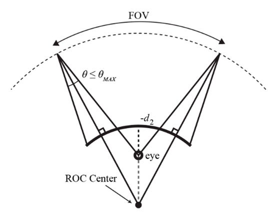 Our goal in creating a curved display is to increase the FOV while sacrificing the maximum aperture size allowed. Specifically, if the display has a radius of curvature (ROC) equal to its distance from the eye, then the FOV will automatically be 180° (or at least the angle subtended by the actual curved device). This behavior is demonstrated visually in Figure 5a.
