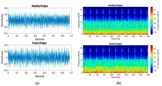 Engine misfire—healthy and faulty: (a) signals; and (b) spectrogram.
