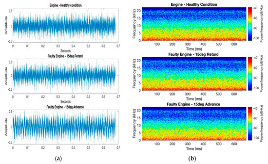 Time-domain data were analyzed for all the cases to understand the characteristics of the signals. The time-domain signals of the engine misfire case are shown in Figure 2a, which shows no conceivable difference between healthy and fault signals. The spectrogram is presented in Figure 2b, which reveals that differentiation between the healthy and the faulty engine is more discernable. The variation can be perceived in every third firing order since the third cylinder was cut off. However, in the case of more complex faults such as ignition timing variation, as shown in Figure 3, the difference becomes more inconceivable. Based on the spectrogram analysis, it can be seen that complex faults require more advanced investigations rather than basic time–frequency domain analysis. Thus, further analyses are presented in the following section for improved fault detection and classification.