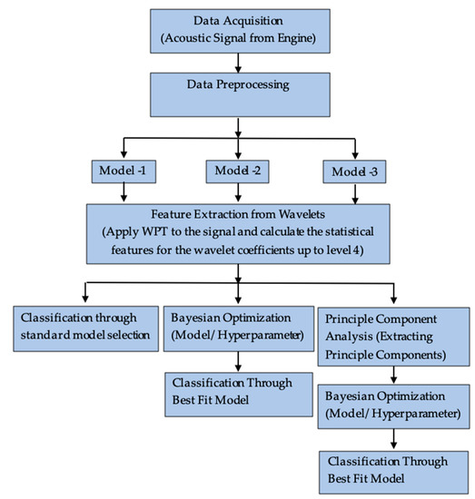 The main objective was to develop and experimentally validate an adaptive fault detection and classification system for vehicles that is robust to different speeds and operating conditions. The acoustic signals were collected from the engine and preprocessed, where the signal was decomposed using WPT and the feature vectors were using statistical measures of the wavelet coefficients. Three models were analyzed and compared—from standard classifiers (Model 1) to Bayesian optimized classification model (Model 2) and finally to PCA combined with Bayesian optimized model (Model 3). A generalized workflow is demonstrated in Figure 4.