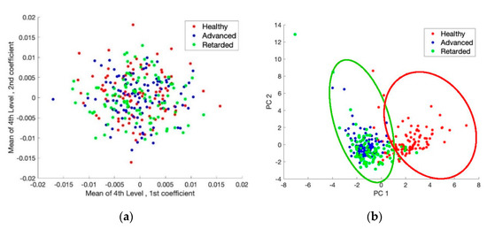Features once extracted can be a useful input for classification, but a large number of features can often result in less accuracy and longer execution time. Therefore, feature space dimension reduction techniques become necessary. PCA is such a technique which computes the PCs commonly by singular value decomposition of a data covariance matrix. PCs are new variables constructed as a linear combination of the initial features. They are uncorrelated due to being orthogonal to each other in the Cartesian space. Taking the ignition timing variation case as an example, Figure 5a shows the plot between two features (the mean values of the first and second sets of coefficients) for different conditions. It can be seen that differentiation among the three conditions is imperceptible. After applying PCA, the first two PCs are plotted as shown in Figure 5b for the three conditions, and it shows that the healthy and the retarded conditions are more distinguishable from each other.