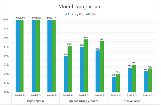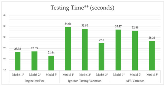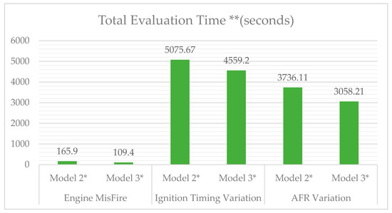 The bar chart in Figure 15 shows the improvement in accuracy and F1 score when using Bayesian optimization over the standard model for all three fault conditions. In engine misfire condition, all three models show the same performance, as classification is apparent in a simple fault scenario, but for the other two more complex faults there is a 5% increase in accuracy by implementation of Bayesian optimized model, and a 3–4% increase in accuracy by implementation of PCA with Bayesian optimized model, compared to the standard model. On the other hand, there is a less significant change in the accuracy and F1 score when comparing Model 2 and Model 3, even though the feature dimensionality has been considerably reduced by using PCA in Model 3. This effect can be demonstrated by comparing their evaluation time.