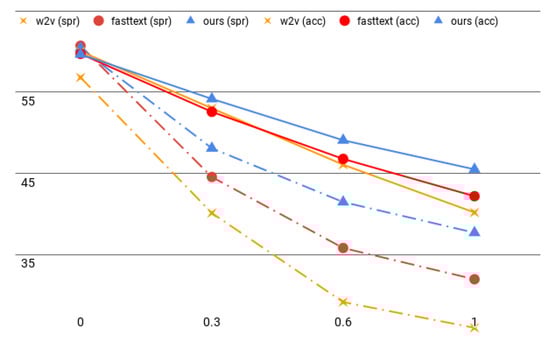 First of all, we show in Figure 2 the dynamic behavior of each model when going from standard texts to noisier ones. In this case, we divided the tasks into two groups based on the performance metric: Spearman correlation or accuracy. The first one encompasses the semantic similarity and relatedness tasks (all STS* and SICK-Relatedness) and the second one the rest of them. Except in the case of word2vec on the first group (yellow lines and crosses), all the models start from a very similar position in the standard scenario. Then, the performance begins its downward trend, where our model starts to stand out above the baselines. As we go towards noisier texts, our model manages to stay above the rest of the lines, increasing the distance margin up until the last stretch.