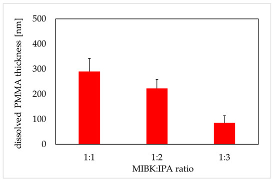 The PMMA is a positive photoresist (a fraction of the photoresist exposed to radiation is soluble in the photoresist developer) with high spatial resolution. MIBK is a strong solvent for PMMA, that is why MIBK is usually diluted with IPA. IPA is a very weak solvent for PMMA and cannot be used efficiently to dissolve PMMA [29]. In our study, the samples of PMMA were irradiated with 600 SXR pulses, and then chemically developed in different MIBK to IPA ratios for four minutes. This duration of the development phase was confirmed in the independent experiments (data not shown). The thickness of degraded PMMA was 290 ± 52, 223 ± 35, and 86 ± 25 nm for the MIBK:IPA ratio 1:1, 1:2, and 1:3, respectively (Figure 3). The results showed a proportional decrease in the thickness of the dissolved PMMA in relation to the increased concentration of IPA in the mixture.