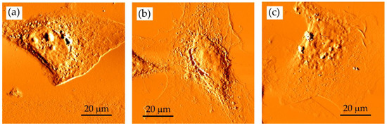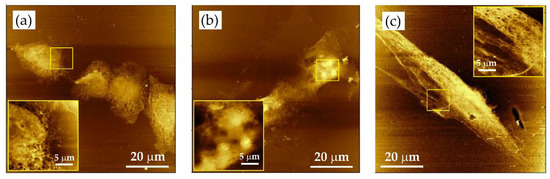 Depending on the cell type, different details were preserved by the SXCM, as revealed by images recorded by AFM working in tapping mode. It turned out that in small and rhombic DU145 cells, the intracellular organelles were densely packed, and it was difficult to visualize their internal structures (Figure 8a). The HCC38 cells are larger and more flattened with clearly visible cell nuclei accompanied by nucleoli (Figure 8b). hMSCs were the largest adherent cells among the cell lines studied. In these cells, the nucleus was less visible. However, it was quite easy to visualize the cytoskeleton elements inside the cell, the sharp edges of the cell membrane, and its projections (Figure 8c). The cell–cell interactions could also be observed (Figure S1).