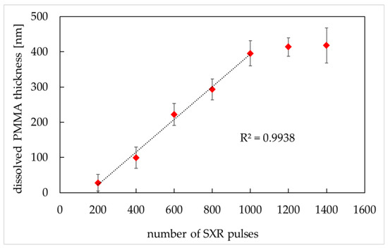 In addition to using an appropriate developer, PMMA degradation depends on the SXR absorbed energy. Therefore, we examined the correlation between the applied number of SXR pulses and PMMA degradation (Figure 5).