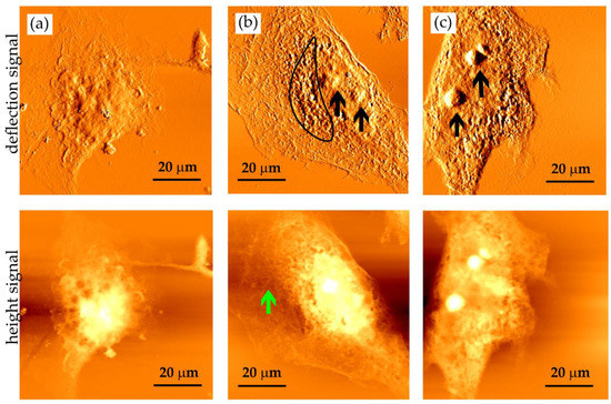 The imprints obtained were visualized using AFM working in a contact mode (Figure 6). After the exposure to 400 SXR pulses, the cell outlines can be observed; however, such large organelles as nuclei are barely visible (Figure 6a). After the exposure to 600 SXR pulses, the cell nucleus is clearly visible (Figure 6b). Inside the cell nucleus, two nucleoli are located (indicated by the black arrows), while the outside region is rich in the rounded structures, which were presumed to comprise endoplasmic reticulum, vacuoles, and mitochondria (outlined with a frame). Within the cell’s peripheral region, filamentous structures could be identified (indicated by the green arrow) as the bundles of cytoskeletal filaments. In some cells, the protrusions were also observed (images not shown). Increasing the absorbed energy up to 800 SXR pulses enhanced the image of the cell nucleus in HCC38 cells (Figure 6c). These cells usually contain more than one nucleolus in their nuclei (indicated by the black arrows). They are poorly visible when lower numbers of SXR pulses were applied. These results showed that depending on the cellular structure studied, the adjustment of the number of pulses should always be conducted.