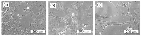 Cell morphology is essential for cell imaging with SXCM because differences in cell thicknesses and internal complexity influence X-rays’ adsorption through the sample. Therefore, in our studies, three human cell lines with significantly different morphology were chosen to show the effect of the soft X-ray radiation absorbed energy on the SXCM based imprint preparation. HCC38 breast cancer cells and hMSC present various shapes and sizes compared to DU145 prostate carcinoma cells under the inverted optical microscope (Figure 7). HCC38 and hMSC cells are of elongated shape with several thin and long protrusions. hMSCs are much bigger, extending up to 400 µm in length. DU145 prostate carcinoma cells, instead, are smaller and of a rhombic shape. The thickness of the attached DU145 cells is approximately 6 µm [34], which is even three times more than the thickness of hMSC cells, which is 2.5–3.5 µm (depending on the number of passages [35]).