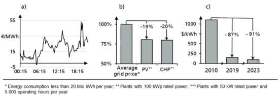 Industrial companies are pressured to minimize electricity costs, which can be achieved in three ways. First, energy efficiency can be increased in order to reduce total energy consumption. Second, manufacturers can reduce energy costs by means of energy flexibility, i.e., adapting the energy demand of a factory to volatile energy market prices, thus consuming less energy in times of high prices and vice versa [3]. Third, power self-generation can also contribute to reducing energy costs, especially when using solar as well as combined-heat and power plants (CHP) (see Figure 1b). Moreover, energy flexibility can be further increased by using stationary batteries. The prices of these systems have decreased sharply in recent years (see Figure 1c) [4] and, as a consequence, the capacity of installed large battery storages in Germany increased by 1500% between 2015 and 2018 [5].