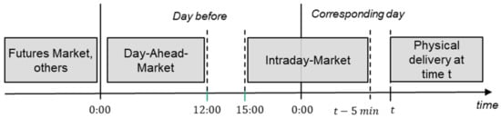 Figure 3. Available short-term energy markets in Germany, depending on the time of delivery t [20].