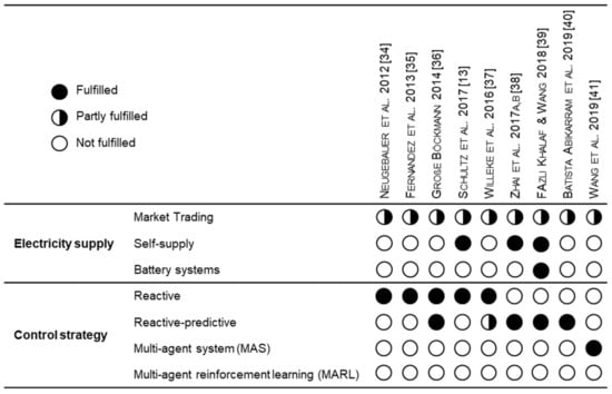 On the control strategy side, mainly reactive and reactive-predictive approaches are applied. It is worth noting that the analyzed reactive-predictive approaches indicate the computation effort and the limited ability for solving large-scale problems. As a result, a joint optimization of both all relevant electricity supply options and production resources is rarely possible when using the applied control approaches because reactive approaches are not suitable for such complex systems, and reactive-predictive strategies require a high level of computational effort, thus contradicting the requirement for short-term reactions. Although a bargaining MAS is developed in [40], RL has not been used in this field of research, but it would be promising given the ability to handle stochastic events and short-term decisions.