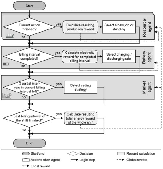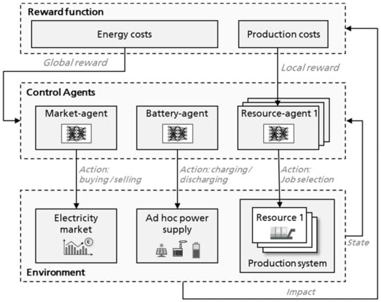 In order to benefit from the aforementioned aspects and reduce energy costs, a suitable, integrated control approach is required. The approach adopted needs to consider the power consumptions of the manufacturing system as well as the power supply using batteries, self-generation plants, and market trading [9]. This paradigm of locally balancing power supply and demand is widely known as a smart grid [10]. Thereby, an intelligent control strategy for efficient electricity usage is derived, based on online date from smart sensors like energy meters. On the manufacturing side, it is the task of production control to schedule manufacturing jobs in the short term and thus ensure logistic objectives like due time or throughput while also determining the energy demand of the production system [11]. As a result, energy costs can represent an additional objective for production control. On the power supply side, the battery, self-generation, and market trading should be controlled. Since every element regarded underlies stochastic impacts like machine breakdowns, generation forecast errors, or changing prices, the system needs to react quickly to such unforeseen events [12]. Regarding the resulting complex optimization problem, multi-agent reinforcement learning (MARL) provides high potential in this field because of its short reaction time and fair solution quality [13]. MARL has already been applied to both production control (e.g., [14,15,16]) and smart grid approaches to non-industrial applications (e.g., [17,18]).