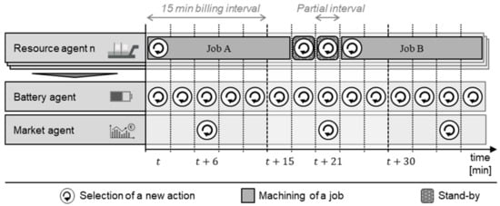 On the operational level, the system is discretized into consecutive time steps t with a length of three minutes. In this case, every 15 min billing interval is divided into five partial intervals, so there are several time steps for adjusting the energy consumption within one billing interval. The resulting system sequence is displayed in Figure 6. In the beginning of every time step, all of the resource agents which have completed their action will choose a new action. Based on this, the battery agent and the market agent select their actions simultaneously. Whereas the battery agent comes into action every partial interval, the market agent only acts every 15 min. This is due to the fact that electricity can only be purchased within 15 min intervals (see Section 2.1). In conclusion, it can be noted that, in total, all agents act in an asynchronous manner.