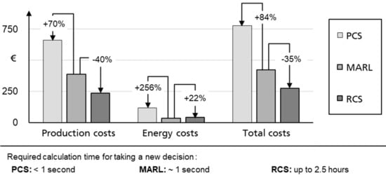 The three approaches have been benchmarked on ten selected production shifts based on energy and production data from the production site. Before this, MARL was trained for 2500 episodes, which took about 5 days. The average of resulting costs of the ten shifts is displayed in Figure 9.