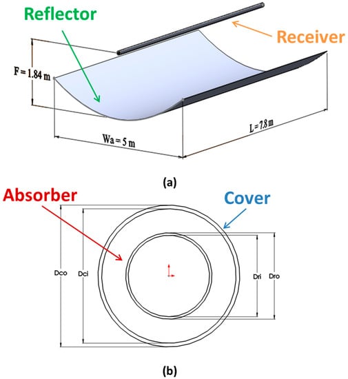 In this work, the module of the LS-2 PTC [18,31,32] is used in order to apply the different performance efficiency approximation formulas. This PTC module is usually studied in the literature studies and it is illustrated in Figure 1a. Moreover, the cross-section of the receiver (cover and absorber) is given in Figure 1b. The collector has 39 m2 area, a concentrating ratio of 22.7 and it has a selective absorber inside an evacuated tube. The emittance of the absorber (εr) is described below [31]: