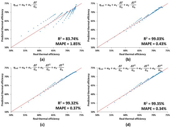 The next step is to present approximation cases with the term “ΔΤ” to be included as an extra term to the previous studies’ formulas of Figure 3. So, Figure 4 exhibits the results about the use of the “a0 + am∙ΔTm/Gb + b∙ΔT” approximation about the thermal efficiency. Figure 4 indicates that the combination of the third power term with the temperature difference term leads to a very good fitting with R2 = 99.92% and MAPE = 0.13%. This high accuracy is obtained with only three parameters and this is a very interesting and promising result. Among the other cases of the “a0 + am∙ΔTm/Gb + b∙ΔT” formula, the use of the fourth power leads to R2 = 99.02%, which is an acceptable result, while the use of the power of two leads to R2 = 98.03%, which presents lower accuracy. Generally, when R2 is over 99% and the MAPE is lower than 0.50%, then the fitting can be evaluated as relatively accurate.