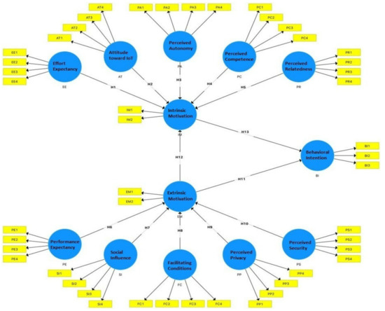 According to our study, we considered intrinsic motivational factors: Effort Expectancy (EE), Attitude Towards IoT (IoTA), Perceived Autonomy (PA), Perceived Competence (PC), Perceived Relationship (PR). The extrinsic motivational factors considered were: Performance Expectancy (PE), Facilitation Conditions (CF), Social Influence (SI), Perceived Confidentiality (PP), Perceived Security (PS) and Behavioral Intention (BI).