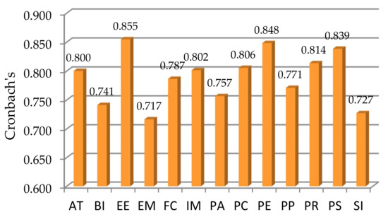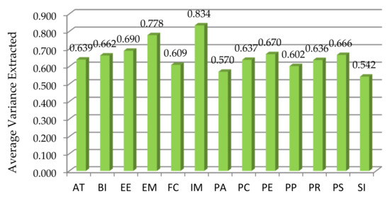 Measurement loads linking factors to indicator variables should generally be significant and range from 0 to 1 [99]. The proposed reflective model is strong and reliable, confirmed by the size of the standardized track loads which are greater than 0.70 and by their reliability which is over 0.50. [100]. Calculating the square of the incarnation of the measurements, it is observed that the reliability of all indicators connected to the latent variables EE, AT, PA, PC and PS registers values between 0.52 (0.721 ^ 2) and 0.86 (0.928 ^ 2). At the same time, the absolute contribution of the indicators used to define the latent variables PE, SI, FC, PP and PP indicates high loads, ranging from 0.50 (0.704 ^ 2) to 0.76 (0.874 ^ 2) [101].