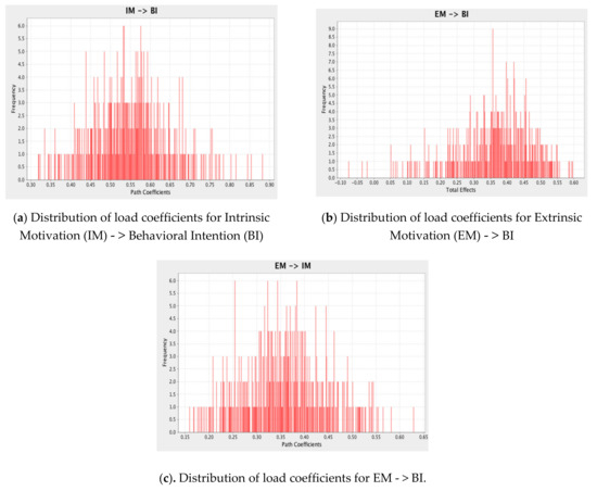 Being always standardized, the weights of the coefficients register variations between −1 and +1, their weights reflecting weaker or stronger ways [98]. Three strong effects are visible among the paths from Perceived Risk (PS) to Extrinsic Motivation (EM) (0.590), from Extrinsic Motivation (EM) to Intrinsic Motivation (IM) (0.344) and from Intrinsic Motivation (IM), respectively, to the Behavioral Intention (BI) (0.542).