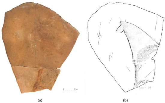 Plaquette 16330A: (a) orthophotomosaic (see Section 4); (b) scanned image of the original tracing of plaquette 16330A published by Villaverde in 1994 (see Section 4.1.3).