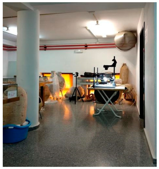 The piece remained exposed at that time in the museum, conditioning the data collection, just one day per week in the morning. It was to be held on Monday, the day the museum is closed to the public, and in the morning. The reduced time taken for the collection meant that only face A could be documented. Data were collected in the room adjacent to the room where the collection of portable art plaquette from Parpalló is kept (Figure 2). It is a room that is usually closed to the public, with glass cabinets and exhibitors that have two windows that overlook an interior patio. During data collection, the crystals were covered with cardboard so that the room was illuminated only by artificial light from the ceiling. The location of the work table under a light source was chosen to avoid shadows on the piece (Figure 2).