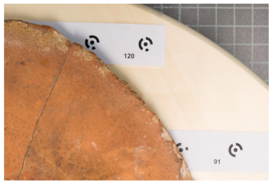 The data collection was planned to obtain a maximum 3:1 scale 3D model with a ground sampling distance (GSD) of 15 microns. One hundred and sixty-two images were taken with the Nikon D800E camera with 36.3 megapixel full-frame complementary metal-oxide semiconductor (CMOS) sensor and Nikon AF-S Micro Nikkor 60mm 1/2.8G ED lens. The instruments used were a KAISER RS 2 XA reproduction table with a 76 cm maximum height and a base of 40 × 50 cm, a 39 cm rotating platform in diameter with coded targets of known object coordinates achieved beforehand by bundle adjustment (Figure 3) and a ColorChecker Passport color chart. The images were taken with a remote shutter, in manual mode with f/16, exposure time 1.6 s, ISO 100 and were saved in raw (Nikon Electronic File) format. The mean object camera distance was 21.1 cm. Longitudinal and transversal passes were made, both in normal and oblique grip (Figure 4a). It was possible to manually move and rotate the turntable and to move horizontally up to 7 cm and tilt the camera mounted on the arm/head of the playback table. Thanks to this strategy, the images were always in focus and with the same spatial resolution. Furthermore, it was possible to obtain a good geometry of the self-calibration network [22,23]. Two hours were required to acquire the photogrammetric dataset (surface area of 313 cm2).