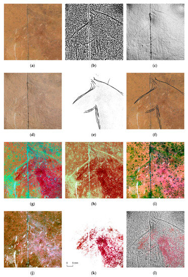 Detail image of the information layers incorporated into the project and the possible resulting combinations: (a) orthophotomosaic; (b) high pass filter; (c) hillshade; (d) overlay of layer (c) with a transparency of 35% on layer (a); (e) final tracing 1994; (f) overlay of layer (e) (masking lines only) on layer (a); (g) DStretch-LRE; (h) DStretch-YRE; (i) DStretch-YBG; (j) DStretch-LYE; (k) pigment masked from layer (g); (l) overlay of layer (c) with 50% transparency on layer (k), which in turn is superimposed on layer (b).
