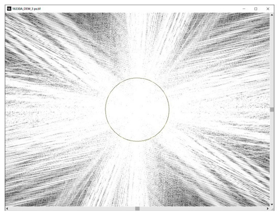 In this section, the Fourier transform application for image filtering is used to automatically extract engraving strokes. The procedure followed is summarized in two steps: (a) scaling the heights of the DEM to work in microns, using the Image Arithmetic tool (Functions/Arithmetic); (b) application of a high pass filter to the scaled DEM using the Fourier transform. The high-frequency enhancement filters (high pass) are intended to enhance any discontinuity, highlight the contrasts between homogeneous areas, emphasizing the lines. The central part of the Fourier spectrum is shown in Figure 7. A star-shaped spatial distribution is observed and has arms that are perpendicular to the dominant orientations. Low frequencies are grouped in the center. Filtering in the frequency domain is started by selecting Fourier Operations (Functions/Fourier). The next step is the study of the radius of the filter to be applied for visualizing the spectrum (Figure 7). The larger the circle radius, the greater the low frequencies range that are removed, and therefore, the more severe the effect of filtering. The chosen radius was 125 pixels. The result is an image where the dark areas represent deep areas (small microrelief depressions and the engraving grooves) (Figure 5b).